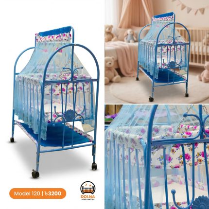 Cool Baby 120 ♦মেটারিয়াল = এম এস পাইপ ♦চাকা ৪টা (২টা লক +২ টা লক ছাড়া) ♦ বেবিদের সুরক্ষার জন্য মশারী দেওয়া হবে। ♦২ টা ঝুলন্ত খেলনা পুতুল হবে ♦কাপড় গুছিয়ে রাখার সেল্ফ হবে। ♦ডাবল মশারী বচ্চাকে দিবে অধিক নিরাপত্তা। ♦৩৫ কেজি + ওজন ধারন করতে পারবে। ♦০- ৩ বছর ব্যবহার করা যাবে ♦সাইজ ৩ফুট/৪ ফুট ♦খাচার সাইজ ২৪ / ৩০ ইঞ্চি ♦খাচা কিভাবে তৈরী-চারো সাইটে পাইপ দেয়া,নিচেও তিনটি পাইপ দেয়া থাকবে +ভিতরে হার্ডবোর্ড দেওয়া বাবু শোয়ার জন্য।                                                                                                                          কালার হবে দুইটা গোলাপি রঙের এবং নীল রঙের.