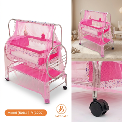 Cool Baby 501 ♦মেটারিয়াল = এস এস পাইপ ♦চাকা ৪টা (২টা লক +২ টা লক ছাড়া) ♦ বেবিদের সুরক্ষার জন্য মশারী দেওয়া হবে। ♦২ টা ঝুলন্ত খেলনা পুতুল হবে ♦ ২৫+ কেজি ওজন ধারন করতে পারবে। ♦০-২+ বছর ব্যবহার করা যাবে ♦সাইজ ৩ফুট/৪ ফুট ♦খাচার সাইজ ২৪ / ৩০ ইঞ্চি ♦খাচা কিভাবে তৈরী-উপরে পাইপ দিয়ে কাপড় দিয়ে তৈরী +ভিতরে হার্ডবোর্ড দেওয়া বাবু শোয়ার জন্য। কালার হবে দুইটা গোলাপি রঙের এবং নীল রঙের
